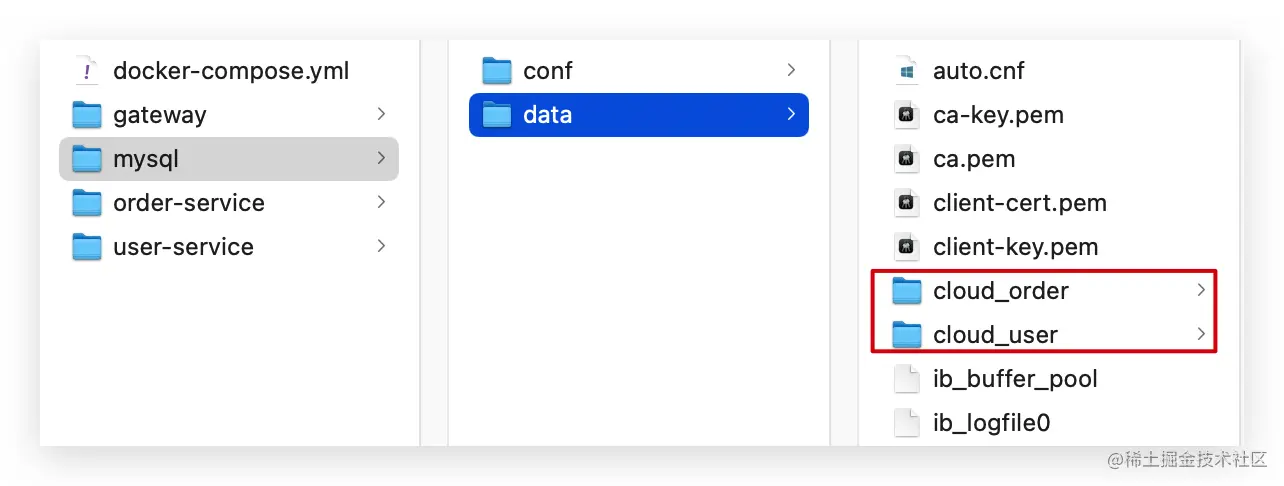 查看mysql目录,可以看到其中已经准备好了cloud_order、cloud_user表: