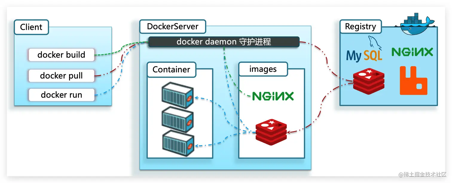 服务端(server):Docker守护进程,负责处理Docker指令,管理镜像、容器等