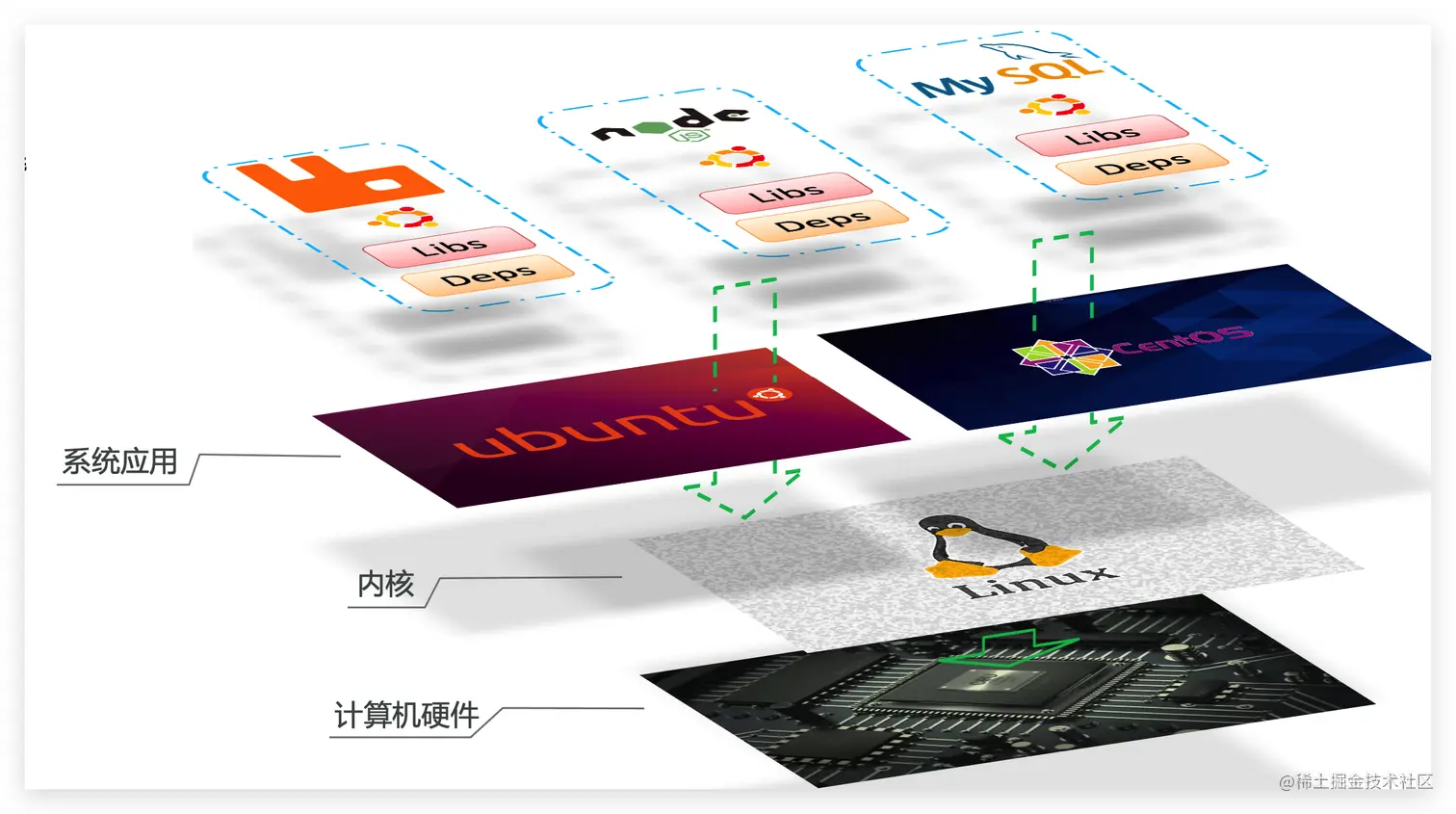 这样打包好的应用包中,既包含应用本身,也保护应用所需要的Libs、Deps,无需再操作系统上安装这些,自然就不存在不同应用之间的兼容问题了。