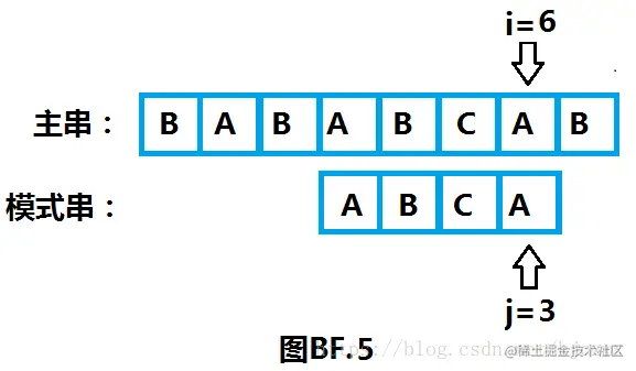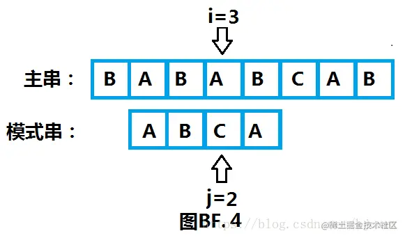 D、 见下图BF.4开始第三步的匹配,T[3] != S[3],所以S中第三个字符是不匹配的,那么将进行回溯,就是一下回到开始的位置,之前匹配的S[0]和S[1]的结果无效了。所以对于i来说赋值为i = 2,对应的j 将返回为j = 0,重复第A、B、C、以上步骤,这里省略。