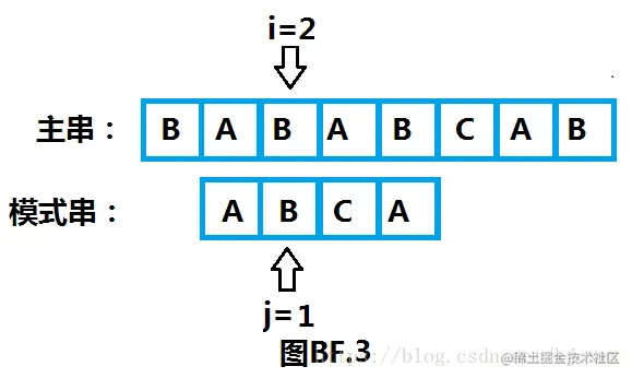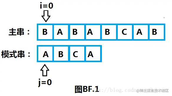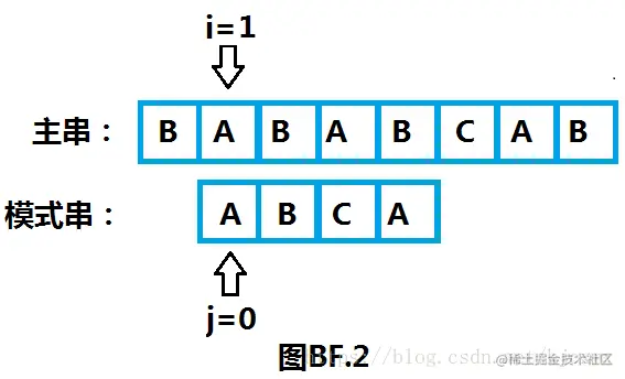A、 见下图BF.1开始第一步的匹配,i = 0,j = 0时(从0开始的),主串的值不等于模式串的值,则进行下一步,也就是 j++而也相应i++。