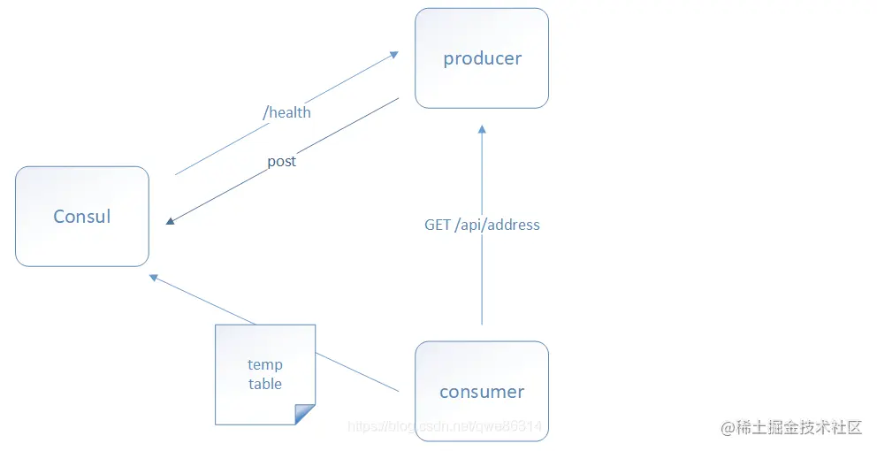 - 当 Consumer 发送 GET 方式请求 /api/address 到 Producer 时,会先从 Consul 中拿到一个存储服务 IP 和 Port 的临时表,从表中拿到 Producer 的 IP 和 Port 后再发送 GET 方式请求 /api/address;