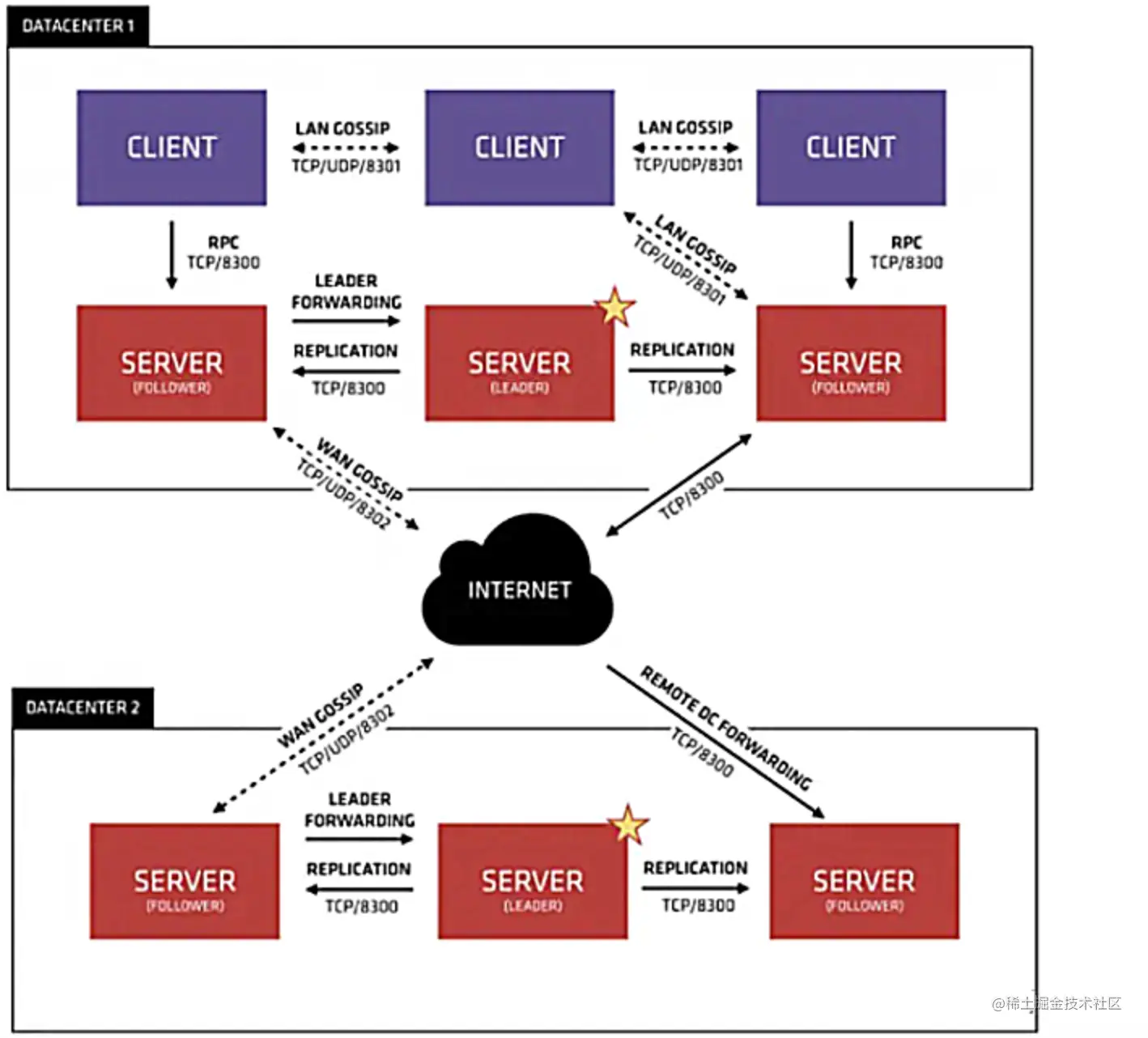 在上图中有两个DataCenter,他们通过Internet互联,同时请注意为了提高通信效率,只有Server节点才加入跨数据中心的通信。