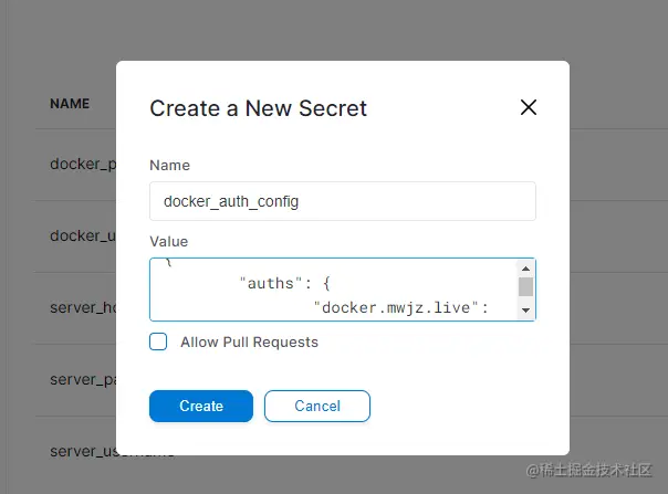 Secret配置仓库登录凭证信息:docker_auth_config,属性值就是 /root/.docker/config.json 文件内容。PS: 注意,登录凭证必须使用