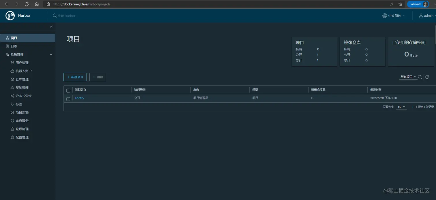 部署完成后,访问 Harbor ,会跳转到登录页,使用 管理员(admin) 账号登录。