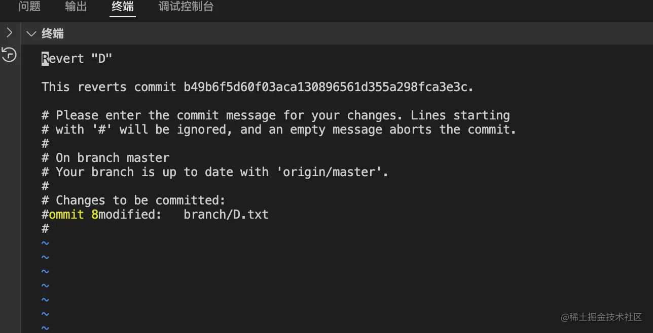 执行完 git revert HEAD后,也有可能出现以下情况,你只需要编辑下描述信息然后保存一下,这样就会生成一个新的commit。