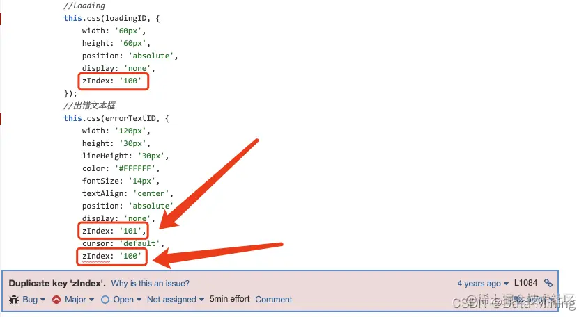 如上图所示,定义了相同属性 zIndex 两次,那么问题来了,到底是赋值 100 生效,还是赋值 101 生效呢?实际上是后面的属性设置生效了,也就是 100,因为前面的设置被覆盖了。因此,我们只能去掉首次的属性设置,才不会影响代码的原有逻辑。