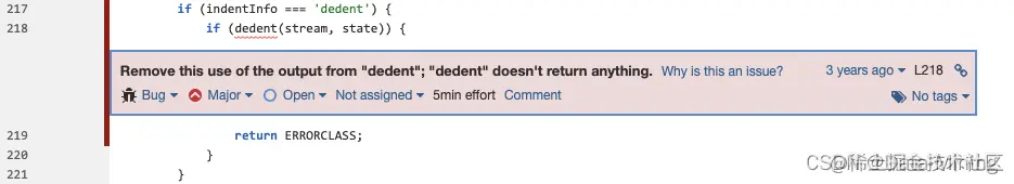为 dedent 方法增加返回值或者去掉返回值的引用逻辑。如上图代码所示,由于 dedent 方法没有返回值,程序永远不会执行 if 判断中的 return 语句。