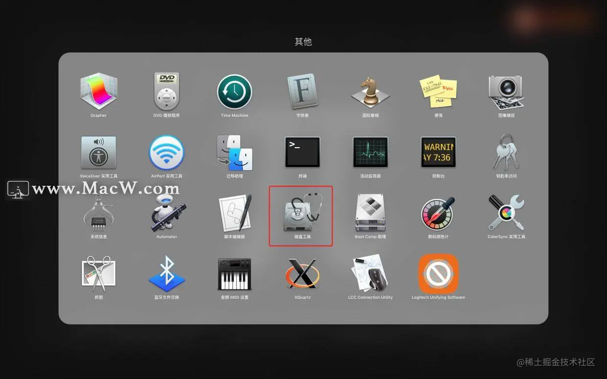 1、启动“应用程序 -> 实用工具(其他)-> 磁盘工具”;
