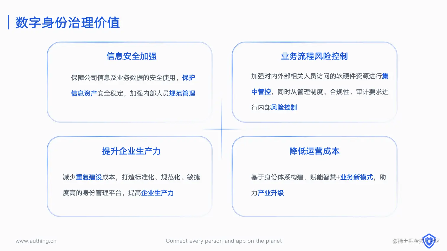 - 减少重复建设成本,打造标准化、规范化、敏捷度高的身份管理平台,提高企业生产力
