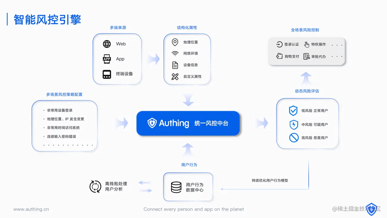 - 统一安全治理: Authing 搭建了风控中台及自适应决策引擎,在人员角色、受保护资源、访问策略、风险控制策略等方面,进行全链路安全审计,提升企业或组织数字化转型过程中的风险控制能力,大规模降低身份相关业务的受损风险。