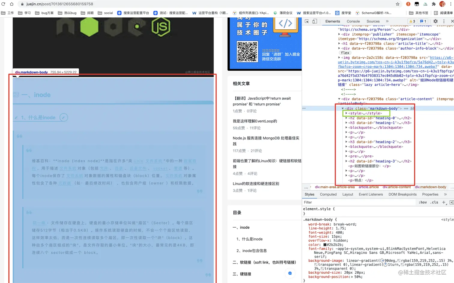 主题其实是一系列的CSS样式,分别对MD转为HTML中的各种元素进行CSS样式设置,这里我就偷懒了,直接借鉴了 掘金 的一部分主题;打开文章源码,可以看到掘金对MD区域做了明显的区分,对比所有主题,发现MD区域的类写死为markdown-body,并且相关主题的CSS样式直接放在了该dom下,这就很方便我们借鉴了😂