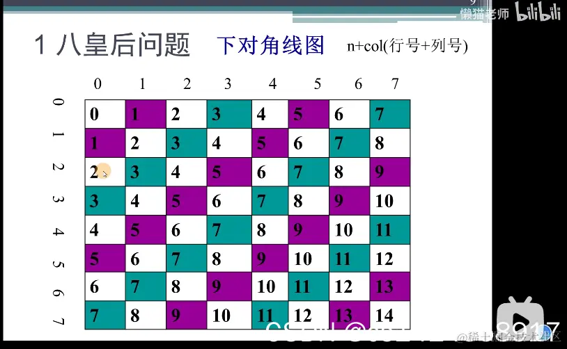 //已知具体的一个点,该点所在对角线的点的值都有相同的值 行-列+ 7