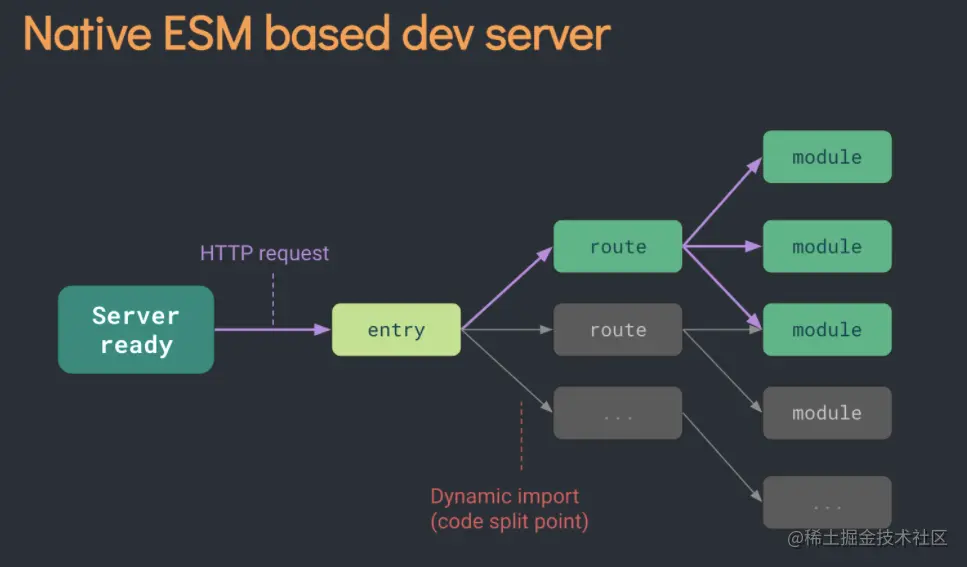 ESM是JavaScript提出的官方标准化模块系统,不同于之前的CJS,AMD,CMD等等,ESM提供了更原生以及更动态的模块加载方案,最重要的就是它是浏览器原生支持的,也就是说我们可以直接在浏览器中去执行import,动态引入我们需要的模块,而不是把所有模块打包在一起。