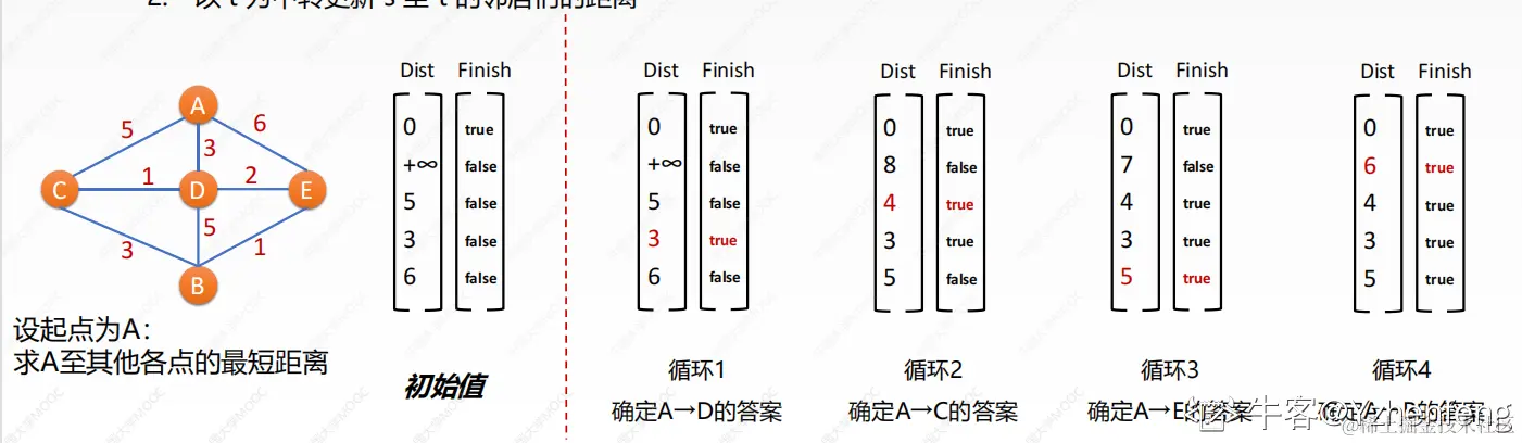 就是每一步循环都能找到 到某一点的最小值,然后保留它,最后的Dist 里就留的是像上图那样,A到各点的最小值