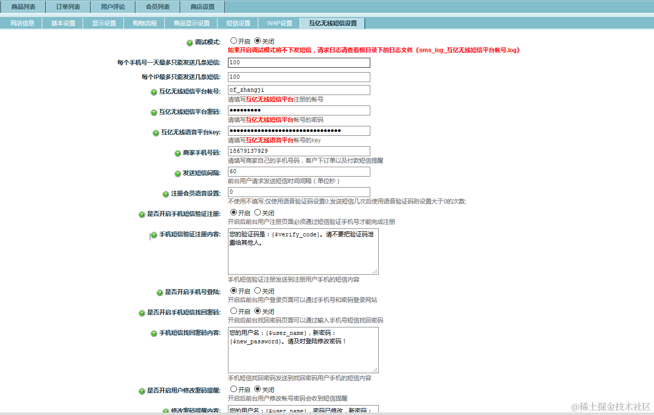 - 设置情况1:后台开启了调试模式,请到 后台商店设置-》互亿无线短信-》关闭调试模式,并且开启相关功能开关!