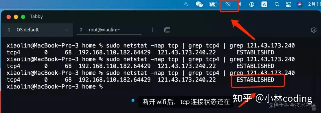 我在我的电脑上做了个小实验,我用 ssh 终端连接了我的云服务器,然后我通过断开 wifi 的方式来模拟拔掉网线的场景,此时查看 TCP 连接的状态没有发生变化,还是处于 ESTABLISHED 状态。