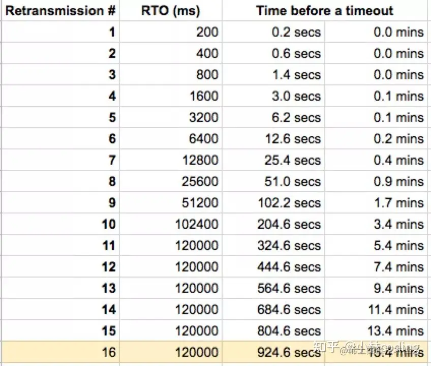 每一轮的超时时间都是倍数增长的,比如第一次触发超时重传是在 2s 后,第二次则是在 4s 后,第三次则是 8s 后,以此类推。