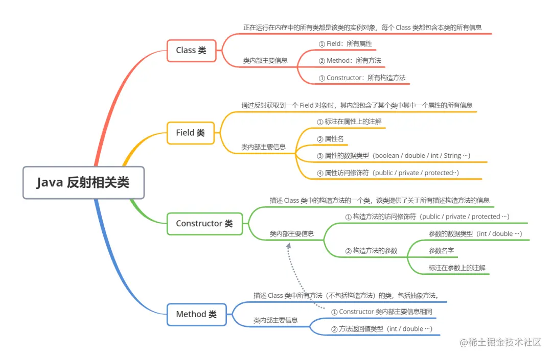 - Constructor:描述一个类的构造方法,内部包含了构造方法的所有信息,例如参数类型,参数名字,访问修饰符······