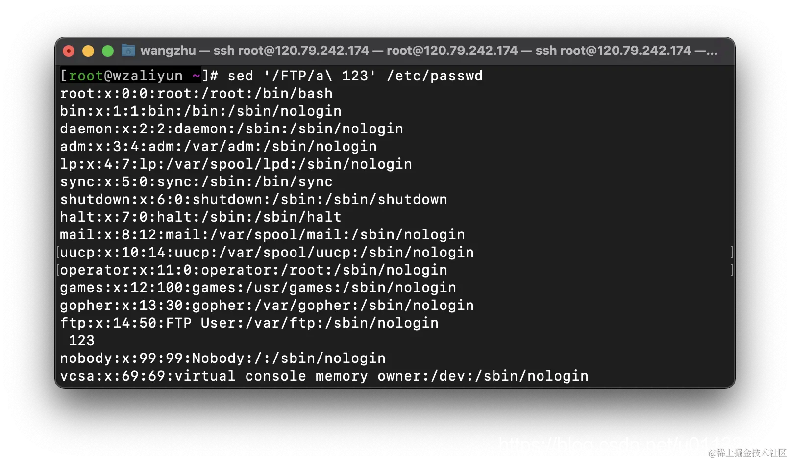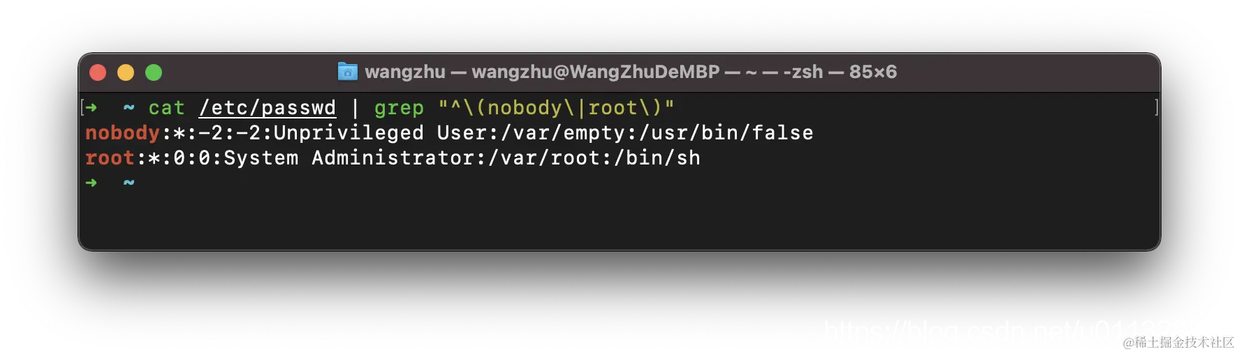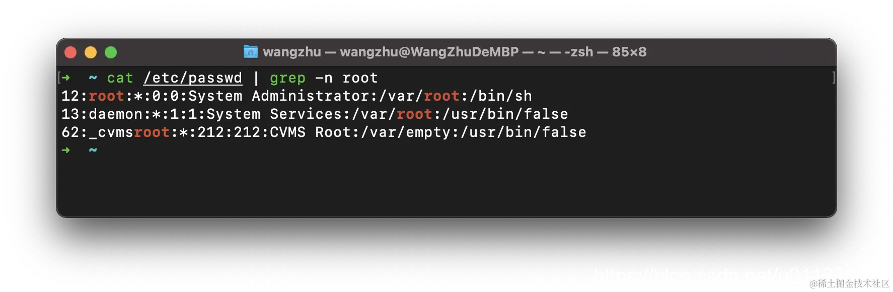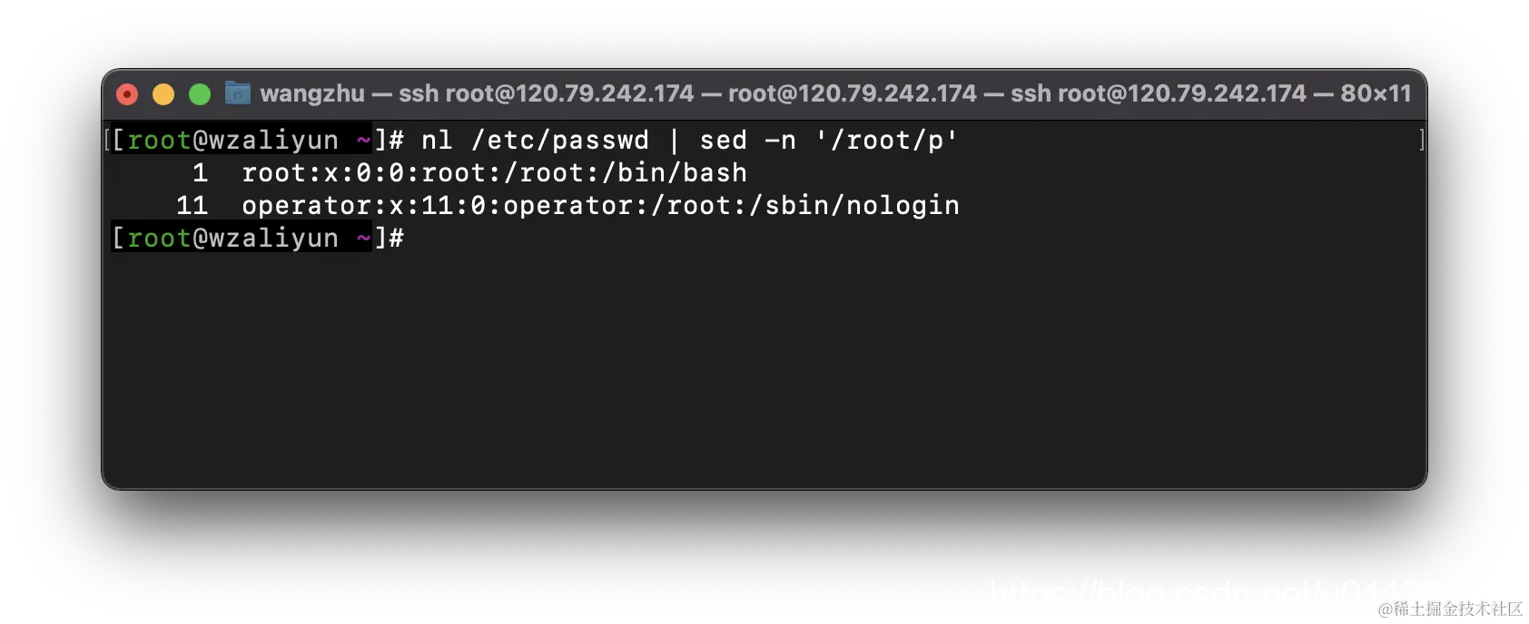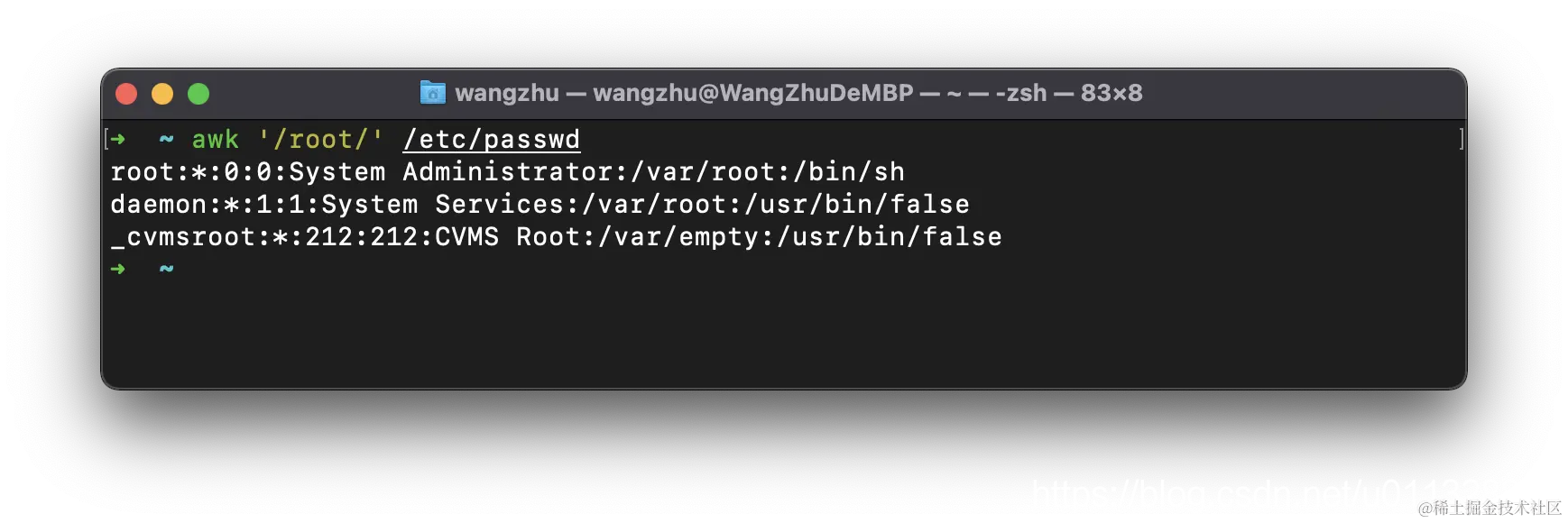 - 以 : 分割,筛选以/root开头,显示结果每行的第一个字段和第七个字段