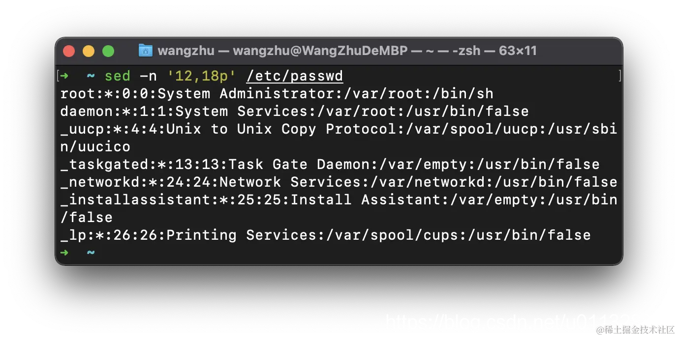 - 以 : 分割,显示passwd的每行的第一个字段和第七个字段