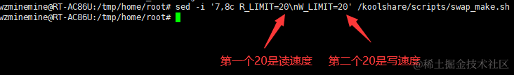 sed -i '7,8c R_LIMIT=20\nW_LIMIT=20' /koolshare/scripts/swap_make.sh