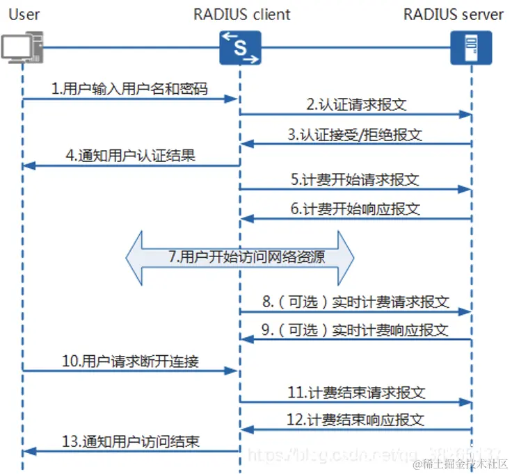 接入设备作为Radius客户端,负责收集用户的用户名和密码信息,并发送到Radius服务器,Radius服务器则根据这些信息完成用户身份认证以及用户授权及缴费,交互流程如下:
