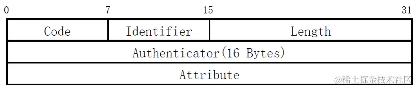 Authenticator:长度为16个字节,用来验证RADIUS服务器的响应报文,同时还用于用户密码的加密。