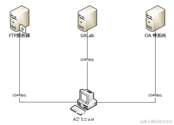 改变原有的认证策略,使需要认证的软件均通过LDAP进行认证,认证后信息存储在AD Server中,终端用户在使用公司内部服务时,都需要通过AD服务器的认证