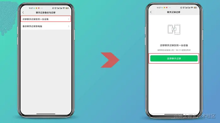 第3步:最后点击“迁移聊天记录到另一台设备”,随后选择所要转移的聊天记录,而且迁移的话是必须要有另一台手机才行哦!根据它弹出的二维码进行扫描即可开始迁移。