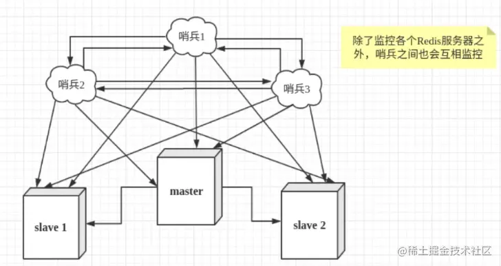 然而一个哨兵进程对Redis服务器进行监控,可能会出现问题,为此,我们可以使用多个哨兵进行监控。各个哨兵之间还会进行监控,这样就形成了多哨兵模式。