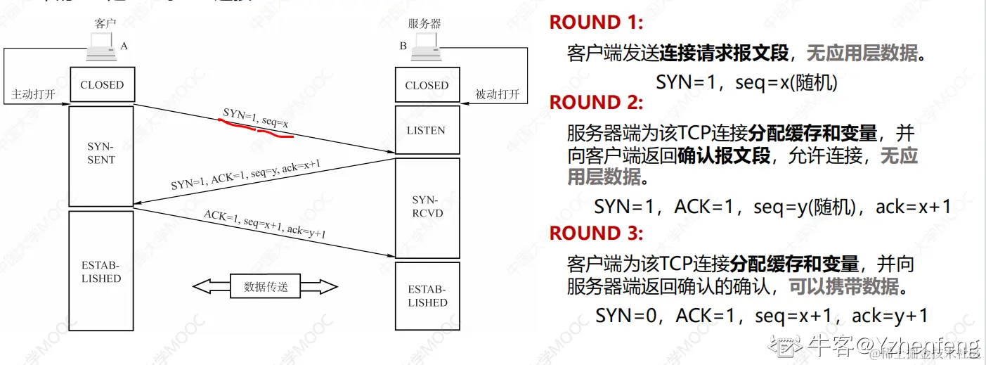 进程首先通知客户TCP,他想建立一个与服务器上某个进程之间的连接,客户中的TCP会用以下步骤与服务器