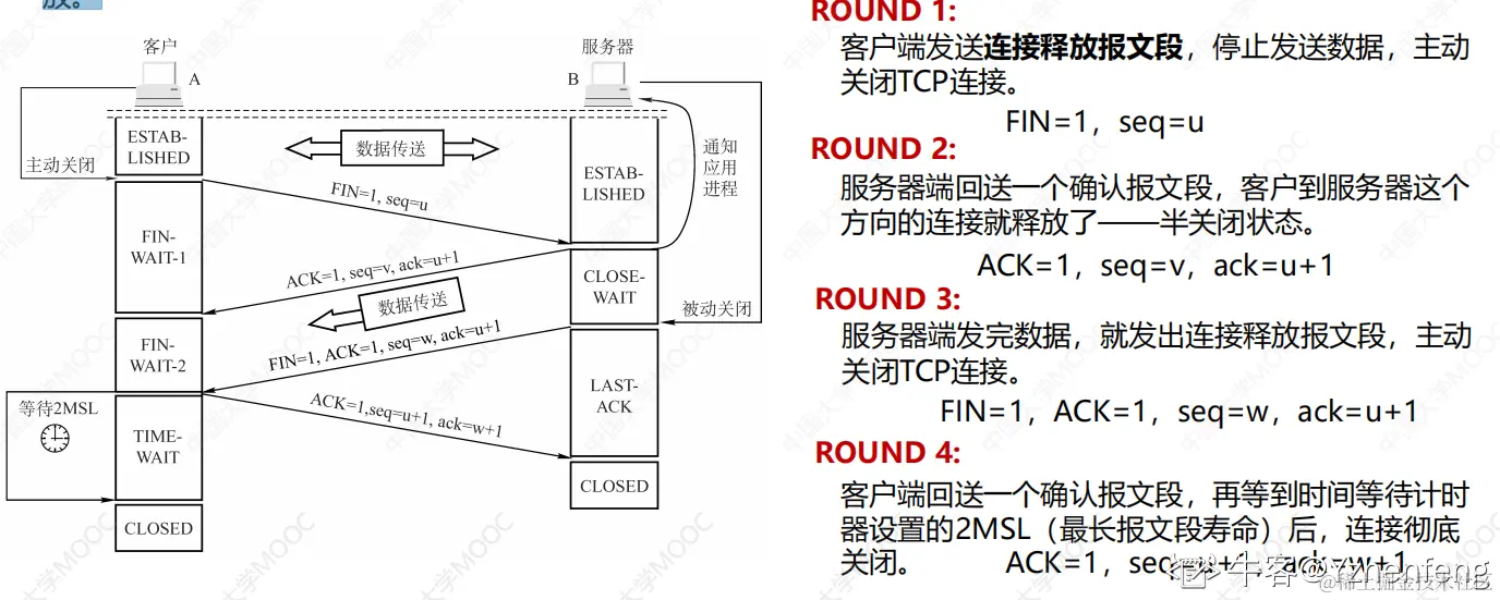 参与一条TCP连接的两个进程中的任何一个都能终止该连接,连接结束后,主机中的“资源”(缓存和变量)将被释放。