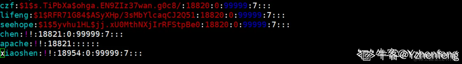 每行的含义:登录名:加密口令:最后一次修改时间:最小时间间隔:最大时间间隔:警告时间:不活动时间:失效时间:标志