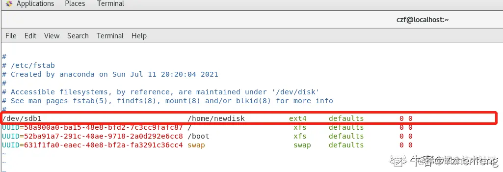 添加内容 /dev/sdb1 /home/newdisk ext4 defaults 0 0
