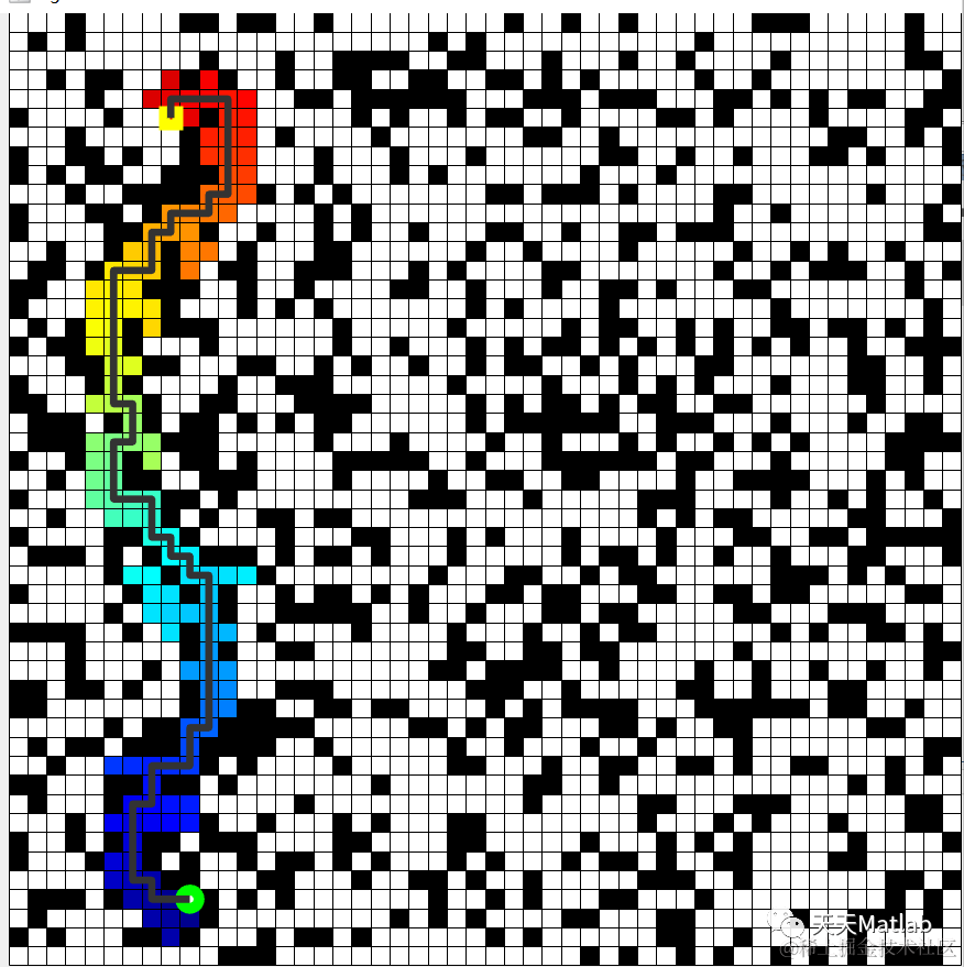 [field, startposind, goalposind, costchart, fieldpointers] =initializeField(n,wallpercent); %随机生成包含障碍物,起始点,终止点等信息的矩阵