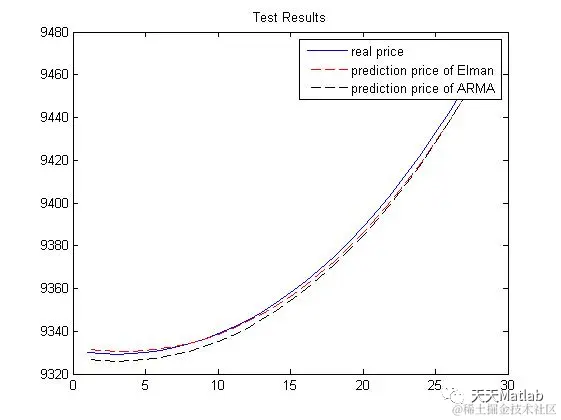 legend('real price','prediction price of Elman','prediction price of ARMA')
