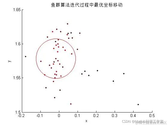 title('鱼群算法迭代过程中最优坐标移动')