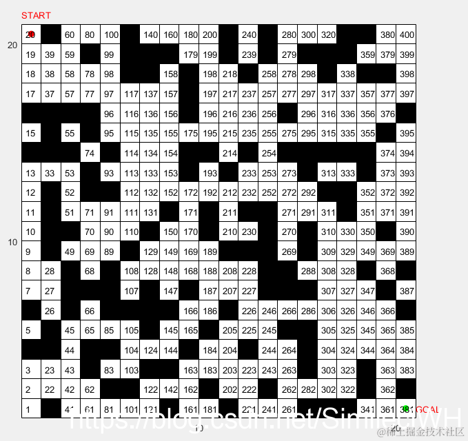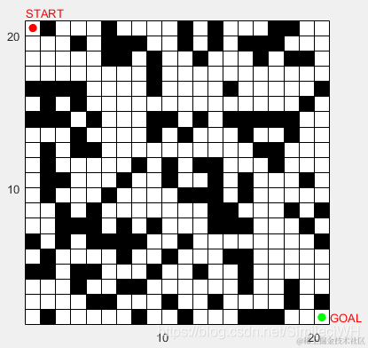 a = load('environment.txt');%blacb--barrier occputy 35%.% a = load('environment6060.mat', 'k');% a = a.k;n = size(a,1);b = a;b(end+1,end+1) = 0;figure;colormap([0 0 0;1 1 1])pcolor(b); % 赋予栅格颜色set(gca,'XTick',10:10:n,'YTick',10:10:n); % 设置坐标axis image xy% displayNum(n);%显示栅格中的数值.text(1,n+1.5,'START','Color','red','FontSize',10);%显示start字符text(n+1,1.5,'GOAL','Color','red','FontSize',10);%显示goal字符hold on%pin strat goal positonscatter(1+0.5,n+0.5,'MarkerEdgeColor',[1 0 0],'MarkerFaceColor',[1 0 0], 'LineWidth',1);%start pointscatter(n+0.5,1+0.5,'MarkerEdgeColor',[0 1 0],'MarkerFaceColor',[0 1 0], 'LineWidth',1);%goal pointhold on