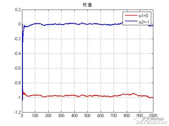 plot(1:length(W2),W2,'b','linewidth',2),title('权值');hold on;