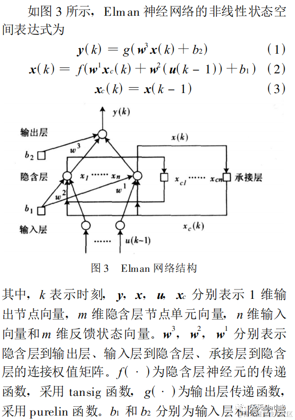 Elman 型回归神经元网络一般分为四层 :输入 层、 中间层(隐含层)、 承接层和输出层, 如图 3 所 示。其输入层、 隐含层和输出层的连接类似于前馈 网络 , 输入层的单元仅起信号传输作用, 输出层单 元起线性加权作用。隐含层单元的传递函数可采用 线性或非线性函数, 承接层又称为上下文层或状态 层, 它用来记忆隐含层单元前一时刻的输出值, 可 以认为是一个一步延时算子。 Elman 回归神经元网络的特点是隐含层的输出 通过承接层的延迟与存储, 自联到隐含层的输入, 这种自联方式使其对历史状态的数据具有敏感性, 内部反馈网络的加入增加了网络本身处理动态信息 的能力 , 从而达 到了 动态建 模的 目的 。此 外, Elman回归神经网络能够以任意精度逼近任意非线 性映射, 可以不考虑外部噪声对系统影响的具体形 式, 如果给出系统的输入输出数据对 , 就可以对系统进行建模 。