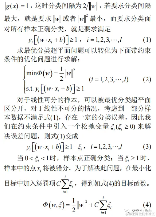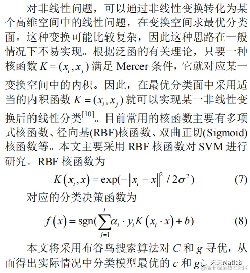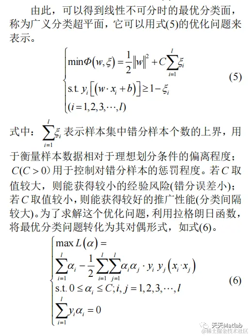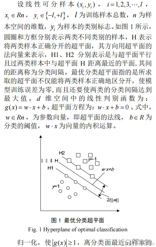 支持向量机(Support Vector Machine,SVM) 是 Vapnik 等人于 1995 年提出的一种基于统计学习理论的新型机器学习方法,它能较好地解决小样本、非线性等实际问题,已成为智能技术领域研究的热点,目前已广泛应用于状态评估、故障诊断、模式识别、化工建模等诸多领域。 支持向量机是由线性可分时的最优分类超平面不断发展来的,其本质是在训练样本数据中找出用于构造最优分类超平面的支持向量,在数学上可归结为求解一个二次优化问题。对于非线性分类情况下的分类问题,支持向量机的总体思路是首先利用一个非线性变换把输入空间数据映射到一个高维的特征向量空间,然后在该特征空间中构造出最优分类超平面,进行线性分类,最后映射回到原空间后就成了输入空间中的非线性分类。