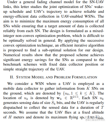 In wireless sensor networks (WSNs), utilizing the unmanned aerial vehicle (UAV) as a mobile data collector for the ground sensor nodes (SNs) is an energy-efficient technique to prolong the network lifetime. Specifically, since the UAV can sequentially move close to each of the SNs when collecting data from them and thus reduce the link distance for saving the SNs transmission energy. In this letter, considering a general fadingchannel model for the SN-UAV links, we jointly optimize the SNs’ wake-up schedule and UAV’s trajectory to minimize the maximum energy consumption of all SNs, while ensuring that the required amount of data is collected reliably from each SN. We formulate our design as a mixed-integer non-convex optimization problem. By applying the successive convex optimization technique, an efficient iterative algorithm is proposed to find a sub-optimal solution. Numerical results show that the proposed scheme achieves significant network energy saving as compared to benchmark schemes.