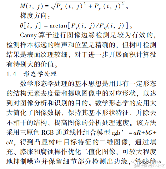在农作物叶面积测量中, 叶形纸称重法、 长 宽系数法、 鲜样称重法、 干样称重法、 回归方程 法等方法的测量都需要将叶片采摘下来, 造成叶 片损坏。 当前使用的叶面积仪器测定方法[1] , 对 于小麦等叶片形状较简单的作物适用, 对于复杂 形状的叶片则有一定的局限。 在图像检测识别 中, 有研究对基于数学形态学的植物叶片图像分 割方法进行了探索[2] 。 本研究通过基于 MATLAB 软件的 Sobel 算子、 Prewitt 算子、 Canny 算子、 形 态学处理等不同算法的比较分析, 选择最优方 法, 再进一步去噪处理, 可实现作物叶面积的 测量。