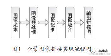 本文所要研究的问题是通过对图像进行匹配与融合,实现同一场景的两张图片的全景拼接。首先对图像进行采集,因采集的图片会受环境因素影响而存在很多质量问题,若直接进行图像拼接,拼接结果会很不理想,因此需要对图像进行相关的预处理以提高图像的质量。利用 SAD 算法实现块匹配,利用加权平均法对图像进行融合,最终实现全景图像无裂缝、无鬼影的拼接。实现全景图像拼接的流程如图 1 所示。想要进行图像拼接,那么首先是要准备拼接的图像。图片采集的基本方法有以下几种:旋转式相机拍摄、手持式相机拍摄和平移式相机拍摄。在图像采集过程中,因为光照,拍摄场景的问题,图片中可能存在一定的噪声,要想得到效果好的拼接图片,在拼接前要对图像进行去燥处理。图像去燥具体方法有:均值滤波器、自适应维纳滤波器、中值滤波器、形态学噪声滤波器、小波去燥[4]。中值滤波器的响应是基于滤波器包围的像素的灰度值的中值,用滤波器包围的图像区域的灰度值代替某个像素点的滤波结果。这是一个非线性滤波器。