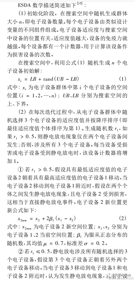 静 电 放 电 算 法 ( Electrostatic Discharge Algorithm,ESDA) 是 Houssem[15]于 2019 年受静电放电事件启发提出的一种新型元启发式优化算法。ESDA 假设电子设备适应度与搜索空间位置有关,利用电子设备个体间直接或间接静电放电现象,通过具有最低适应度值电子设备向高适应度值电子设备移动来改变其位置以获得最佳空间位置,即问题最优解[15]。与传统群智能算法相比,ESDA 设置参数少、收敛速度快、寻优精度高,是一种具有较好竞争力的群体智能算法。