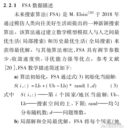 未来搜索算法(Future search algorithm,FSA) 是 M. Elsisi于 2018 年通过模仿人类向往美好生活而提出的一种新颖搜索算法。该算法通过建立数学模型模拟人与人之间最优生活( 局部搜索) 和历史最优生活( 全局搜索) 来获得最优解。