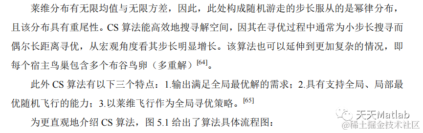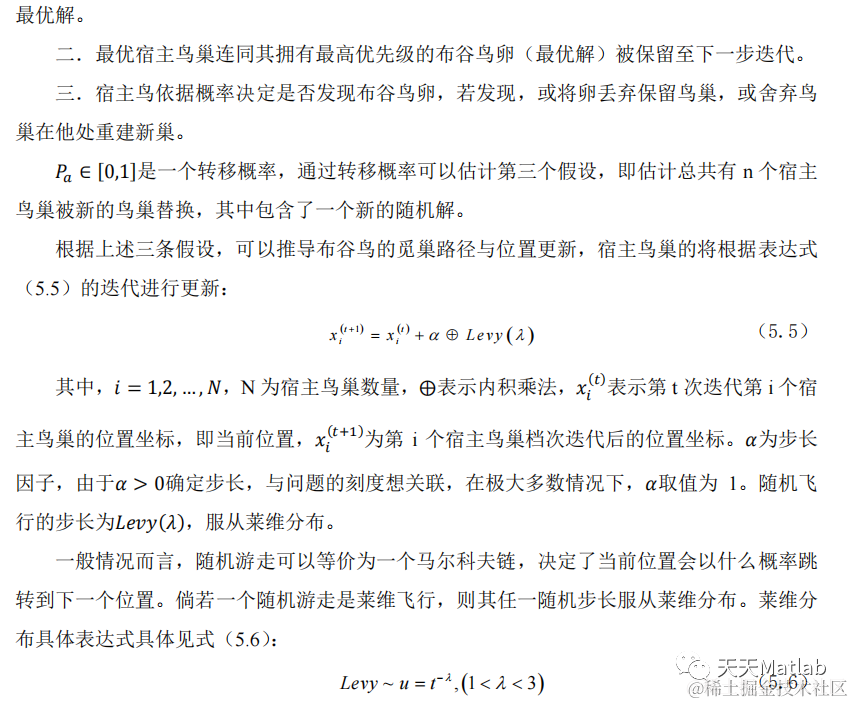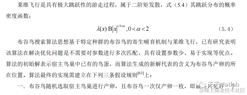 布谷鸟搜索(Cuckoo Search, CS)算法是 2009 年 Xin-She Yang 与 Susash Deb 提出的一种新型的启发算法[61]。算法灵感来源于一些布谷鸟种属(Cuckoo Species)的专性寄生哺育(BroodParasitism)行为,即这些种群不会像绝大多数鸟类一样自己筑巢哺育后代,而是通常把蛋产于宿主鸟巢内,由宿主代养,这种行为被称为巢寄生。此类布谷鸟会观察宿主鸟所产的卵并对其进行模仿,按照宿主鸟卵的颜色形状来产卵,导致宿主鸟辨别出布谷鸟卵的几率微乎其微,布谷鸟卵混在宿主鸟卵中,孵化后由宿主鸟哺育并与宿主雏鸟争夺生存资源。然而,布谷鸟卵一旦被宿主鸟识破情况便不同,宿主将完全摧毁鸟巢或是仅仅将布谷鸟卵摧毁。因此布谷鸟在繁殖季会寻找孵化周期类似、雏鸟习性类似以及卵外观类似的宿主鸟。布谷鸟通常会趁宿主外出时将卵产于巢内,有时会将宿主卵推出巢后进行产卵,使布谷雏鸟独享生存资源,以提高生存几率。此外,布谷鸟等动物的觅食过程是也是一种有启发性的随机行为过程。所在位置确定移动的下一个目标点,所选取的数学模型决定移动方向。根据当前位置与到下一个位置的转移概率,它们会飞向或是走向搜索路径。鸟类的这种飞行行为,在很多研究中被证明为莱维飞行(Levy Flight)的典型特征