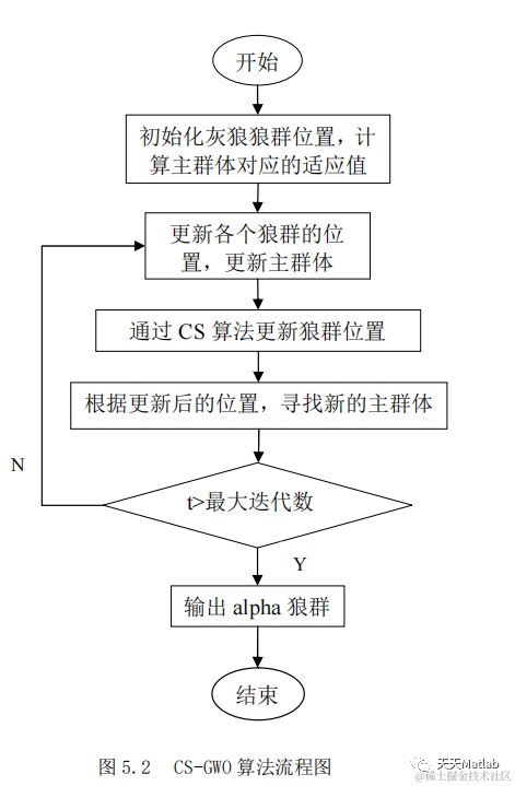 GWO 的这种位置更新方式缺陷十分明显:全局搜索能力薄弱,有较高的概率陷入局部最优解,尤其是在使用高维数据集时。而 CS 算法在更新宿主鸟巢的位置时,主要是通过寄养行为与莱维飞行两种操作实现。因而算法搜索步长或长或短都有几乎相等的概率,并且移动方向的选择具有高度随机性。此外,算法更容易从当前区域跳转到其他区域,完成全局搜索。基于 CS 算法的以上优点,本章将 CS 算法与 GWO 结合以提高 GWO 算法的性能,提出经布谷鸟搜索算法改进的 GWO 算法(CS-GWO),改善了 GWO 算法存在的易于陷入局部最优的问题。CS-GWO 算法具体流程图如图 所示: