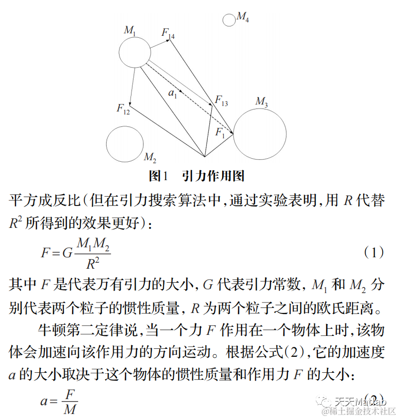 2009 年伊朗的克曼大学教授 Esmat Rashedi 等人提出了引力搜索算法[5(] Gravitational Search Algorithm),该算法是基于牛顿万有引力定律:“在宇宙间,每一个粒子由于万有引力的作用而彼此相互吸引,这力的大小与粒子的质量成正比,与他们之间的距离成反比”。